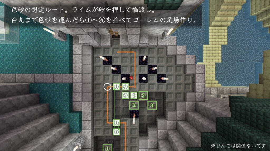 ・オレンジベッドにオレンジ色砂を運ぶ。その上にオレンジゴーレムを乗せて寝る