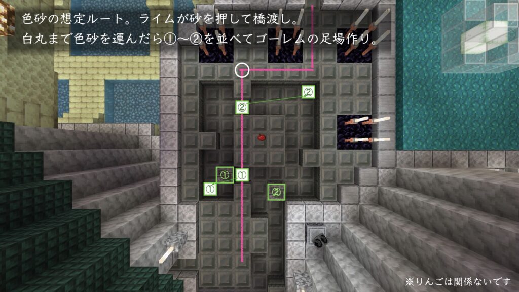・赤ベッドに赤色砂を運ぶ。その上に赤ゴーレムを乗せて寝る