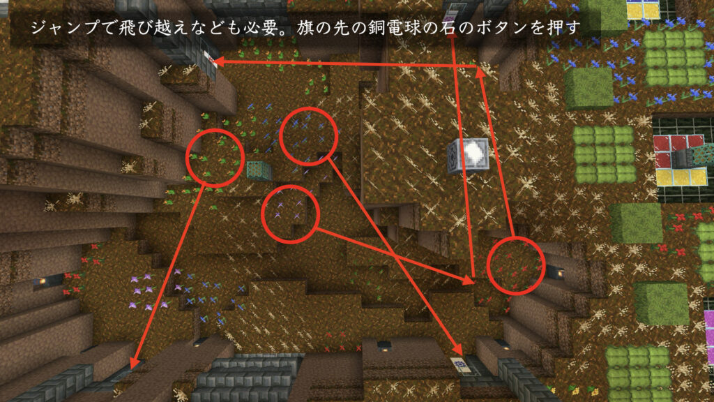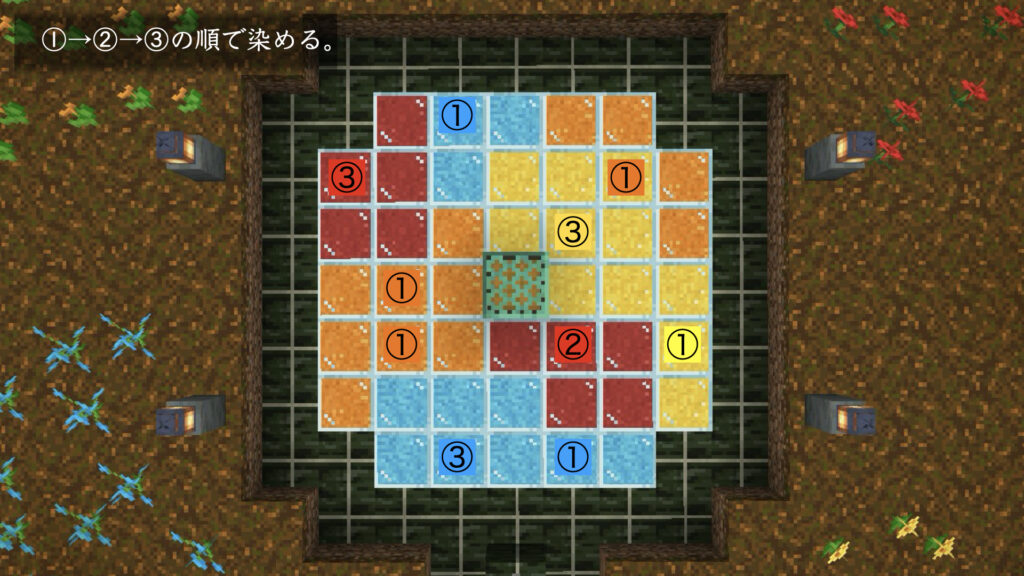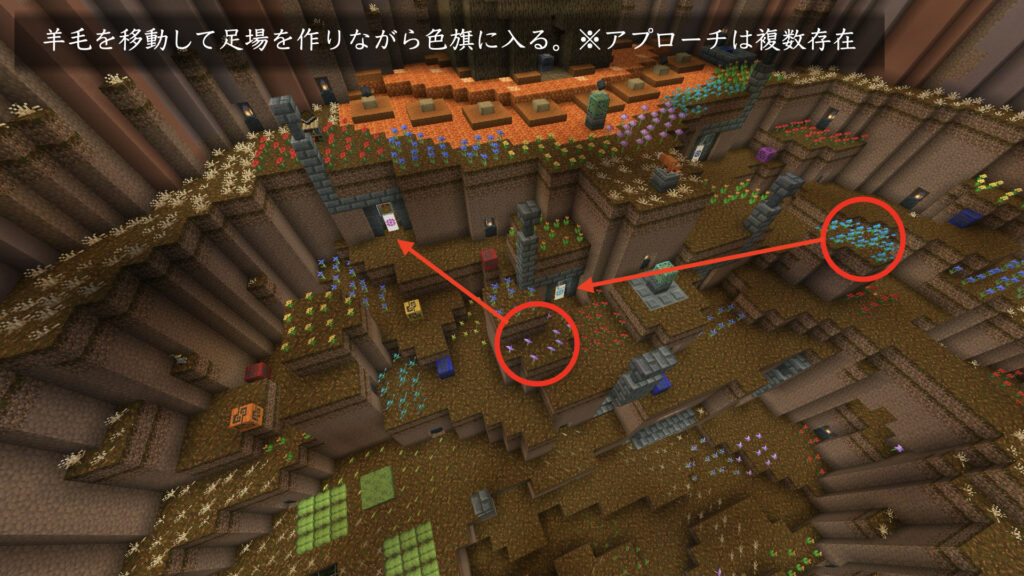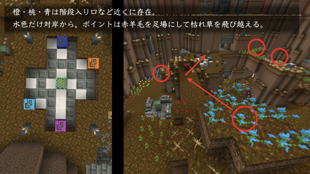 4色のうち水色の羊毛だけ近くにない。奥の段差エリアをうまく使う。