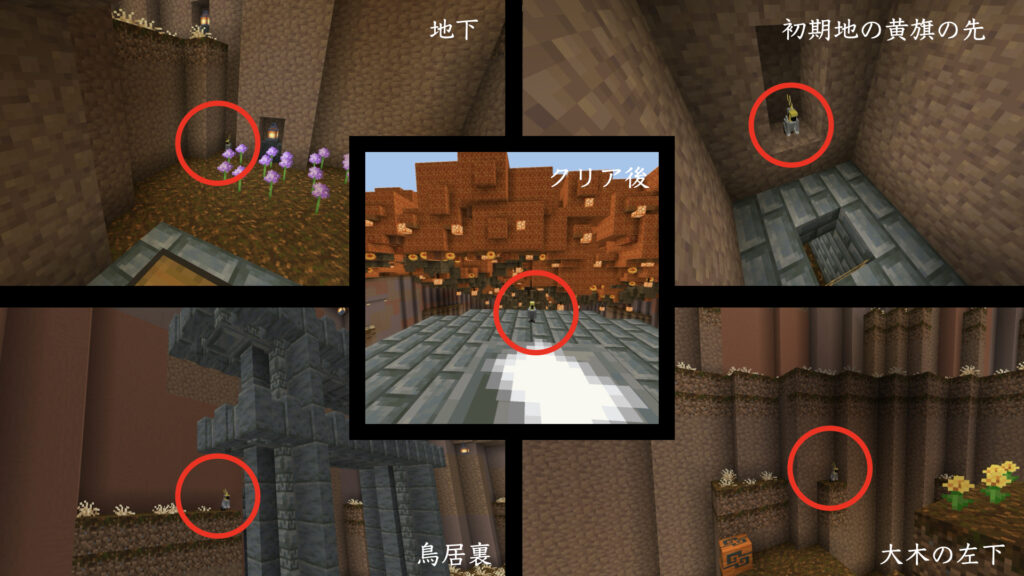地上の壁の4箇所と栗の木の隣に、羊毛で隠されたチェストが5個ある。
